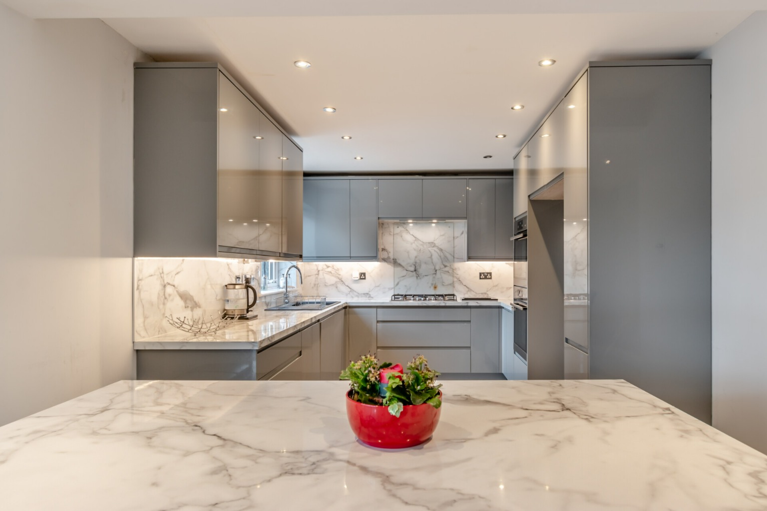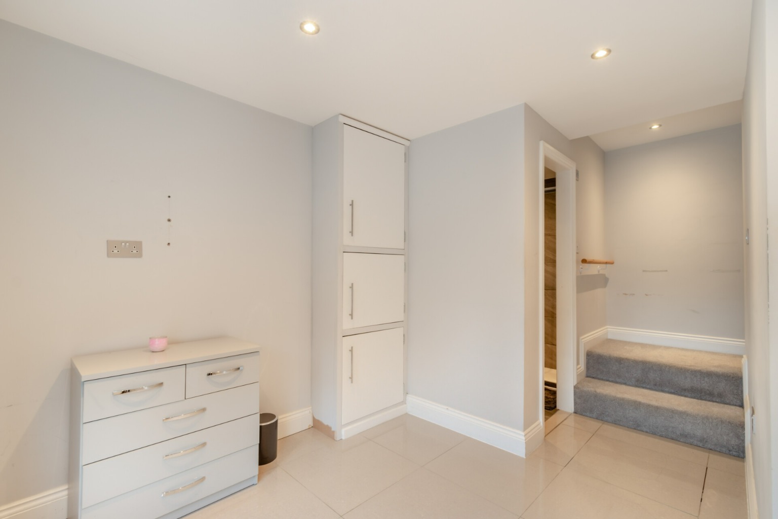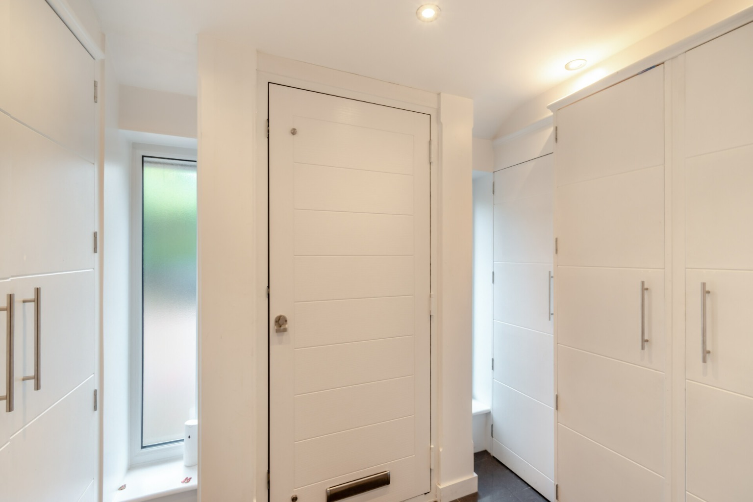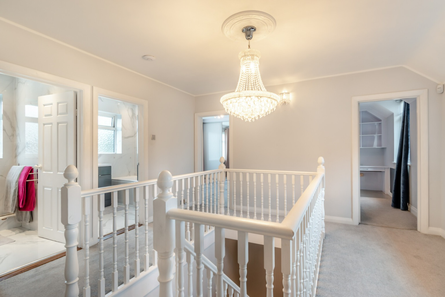 On the first floor, a galleried landing provides access to the master bedroom, which is fitted with custom-designed furniture. The three other bedrooms have been carefully designed with children in mind, each featuring bespoke furniture and dedicated workstations. This floor is serviced by a family bathroom and a separate shower room.