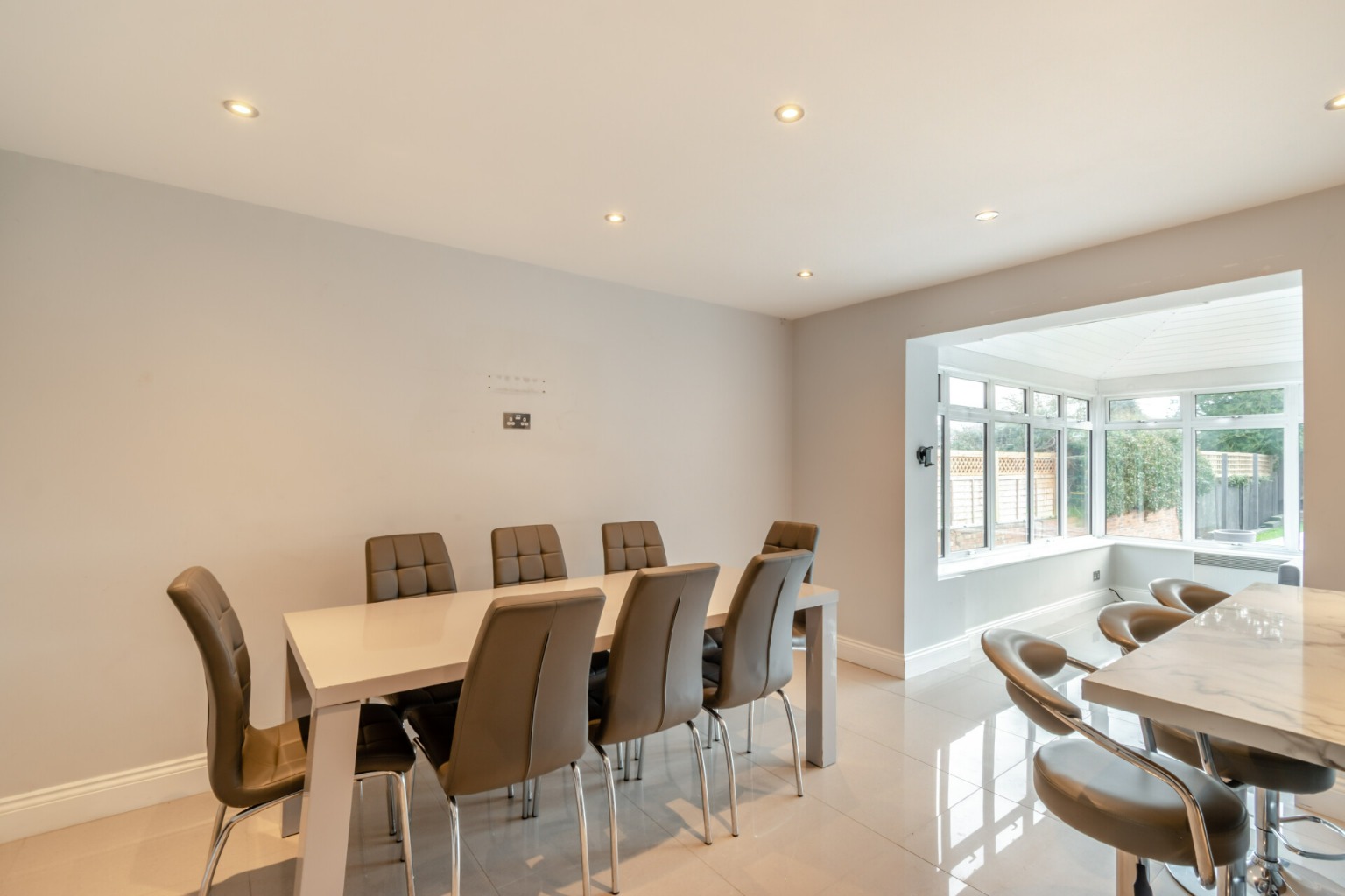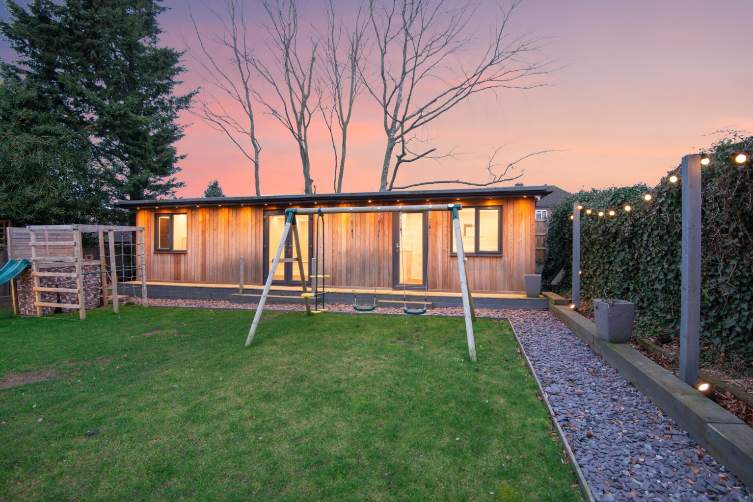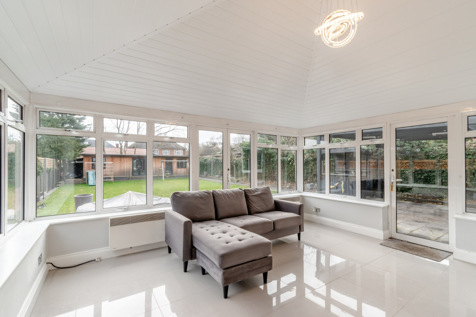 Upon arrival, you are welcomed by a spacious entrance hall that leads to a well-proportioned, double-aspect lounge. The beautifully appointed kitchen/dining room extends into a garden room with a striking vaulted ceiling. Additionally, a versatile reception room serves as a potential fifth bedroom, playroom, or study, complete with an ensuite shower room and WC.