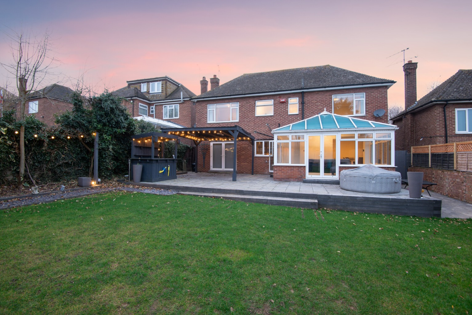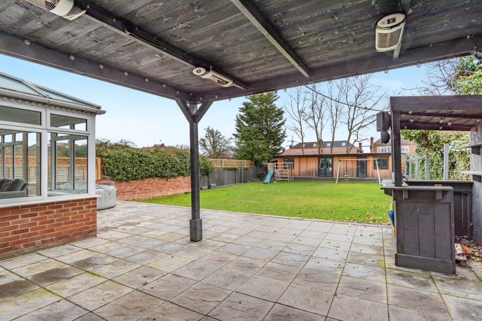 Outside, the property offers an extensive block-paved driveway. The rear garden features a spacious patio terrace with a bar and a heated pergola, ideal for al fresco dining. A wide expanse of lawn leads to a substantial outbuilding that includes an office, a separate gym, and a large storage area.